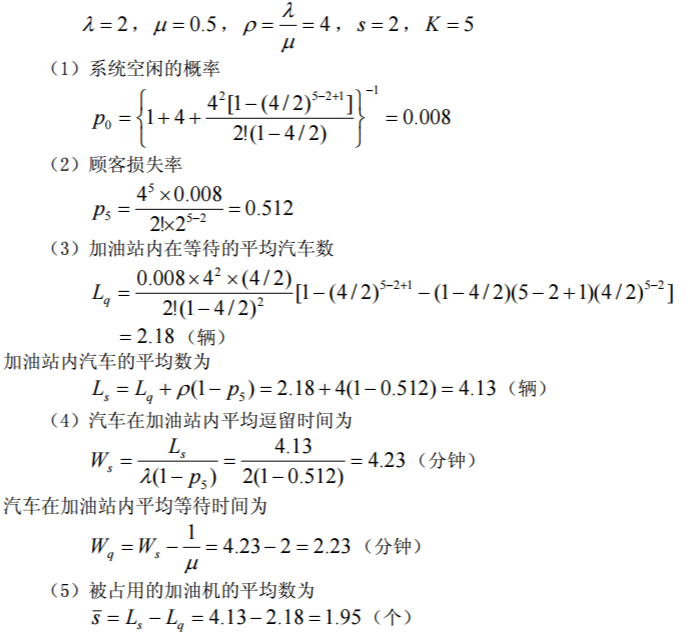 例 6 某汽车加油站设有两个加油机,汽车按 Poisson 流到达,平均每分钟到达 2 辆;汽车加油时间服从负指数分布,平均加油时间为 2 分钟。又知加油站上最多只能停 放 3 辆等待加油的汽车,汽车到达时,若已满员,则必须开到别的加油站去,试对该系 统进行分析。