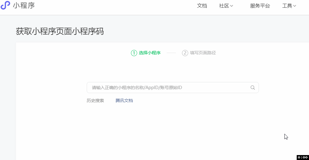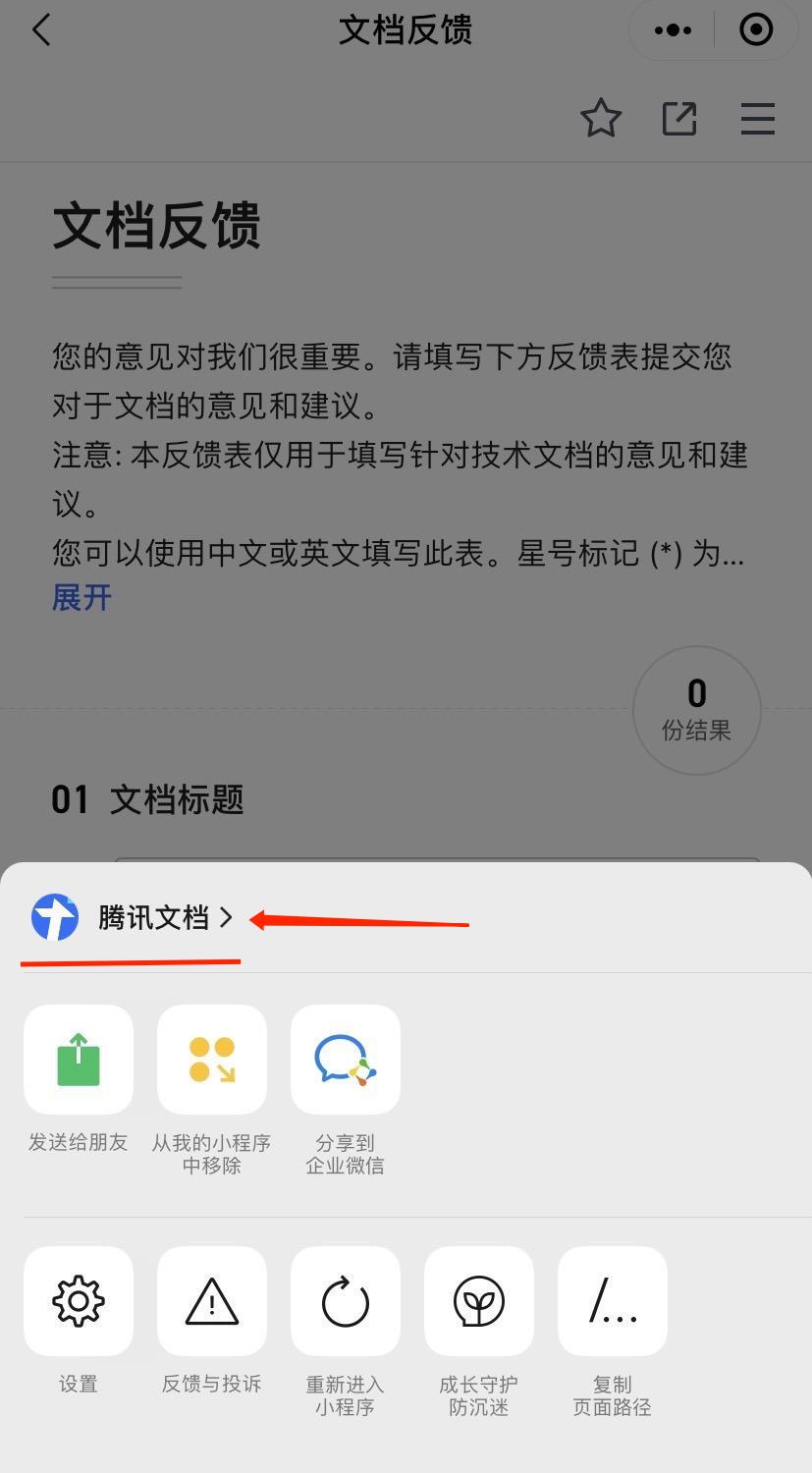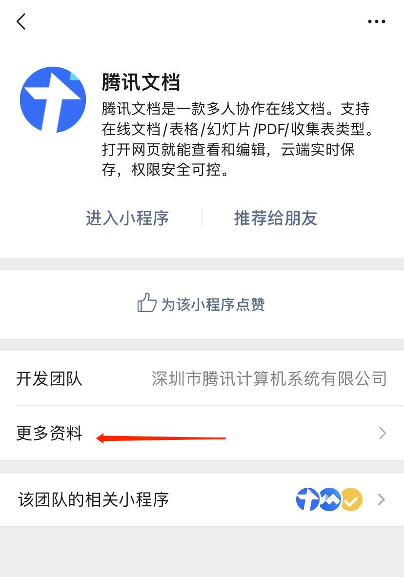 在右上角 工具 -> 生成小程序码 -》搜索:腾讯文档 -> 在输入框下的:获取更多页面路径 -> 在开启入口处输入:微信号(当前使用小程序手机的) -> 点击:开启