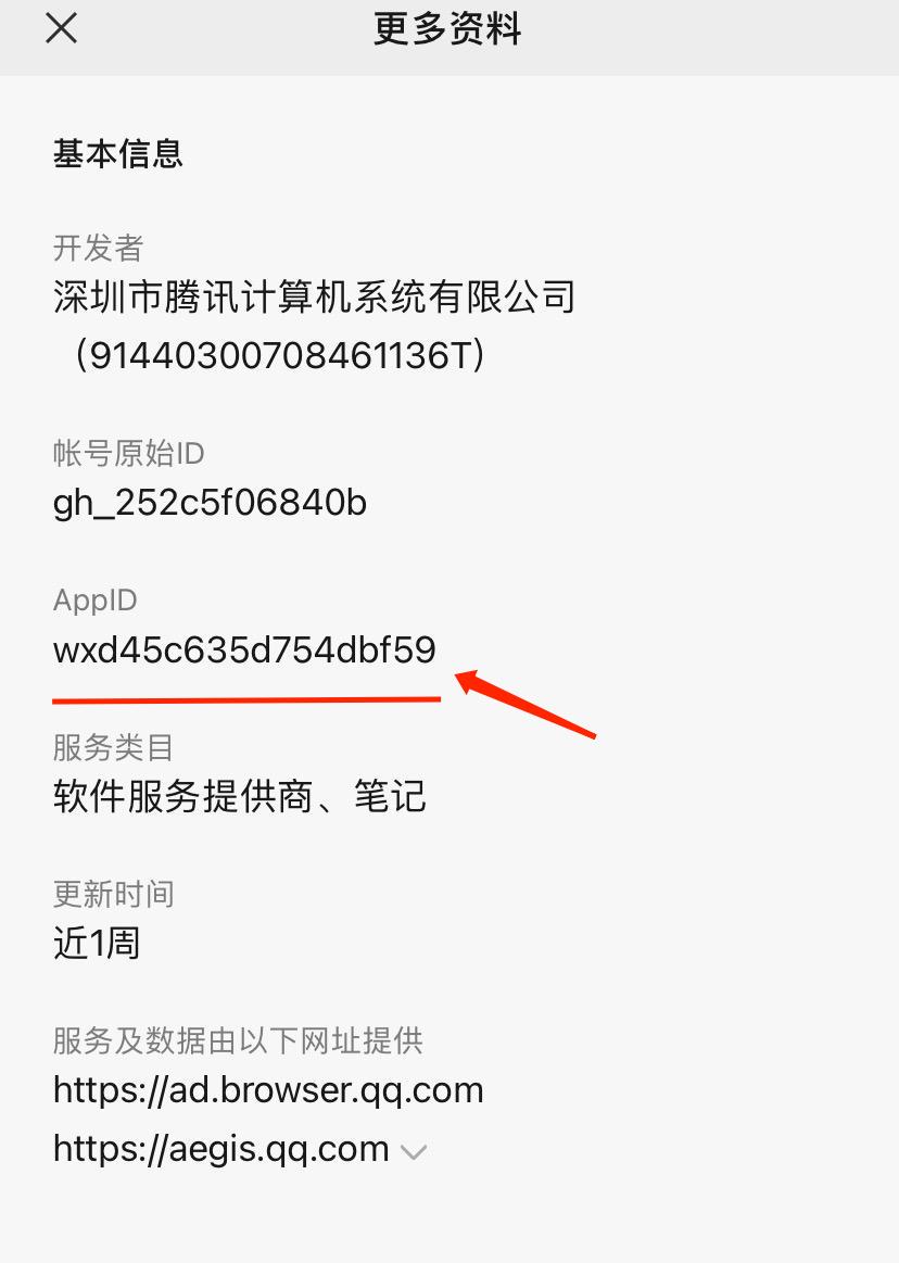 3、获取腾讯文档小程序的AppID:wxd45c635d754dbf59