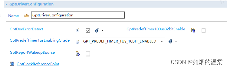 GPT Predef Timer :是由GPT Driver提供的一个自由运行的计数器。如果计时器已经达到最大值(最大值= 2n -1, n=比特数),计时器将在下一次计时器滴答时继续运行,值为“0”。哪些GPT预定义定时器可用,取决于硬件(时钟,硬件定时器,预分频器,定时器寄存器的宽度,..)和配置。GPT Predef Timer具有预定义的物理时间单位和范围。除非有特殊要求,一般随便选一个配置。