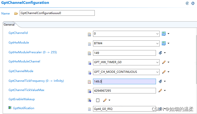 - GptHwModulePrescaler (0 -> 255):硬件模块预分频值(预分频有点复杂,这里一般按要求配置就好)