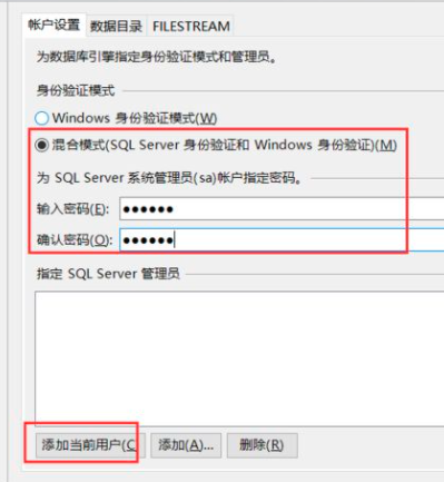 13.选择“混合模式”,输入sa账户的密码,然后点击“添加当前用户”,当用户添加后才能点击“下一步”