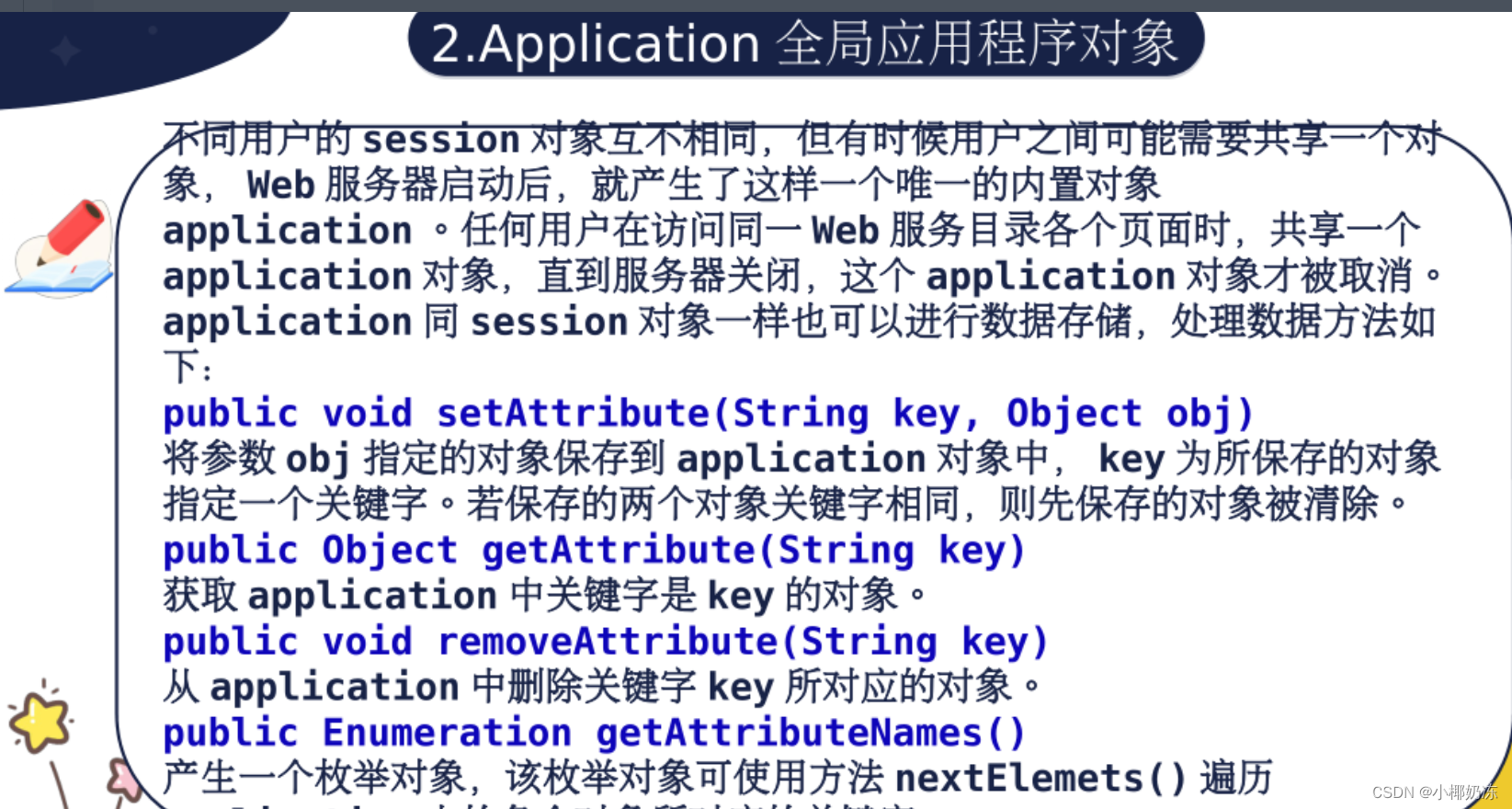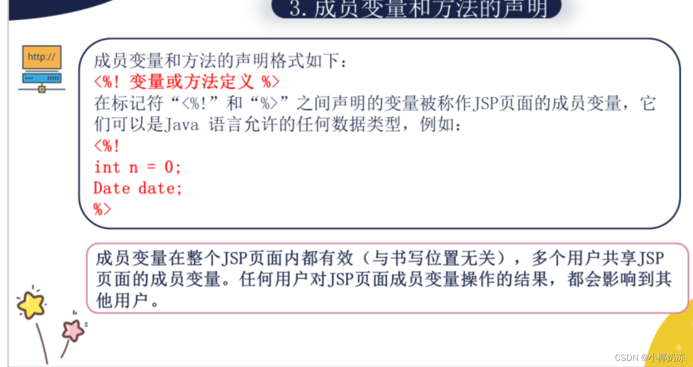 2.<%! %>:是用来声明的,声明应用程序的全局变量或者当前页面的方法。