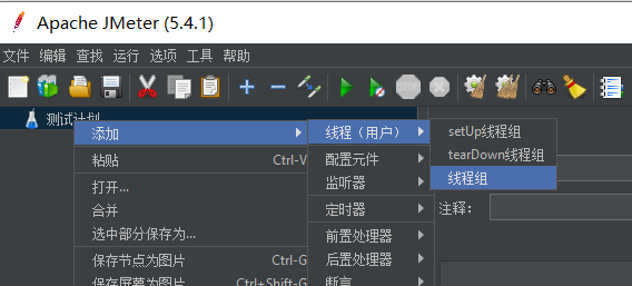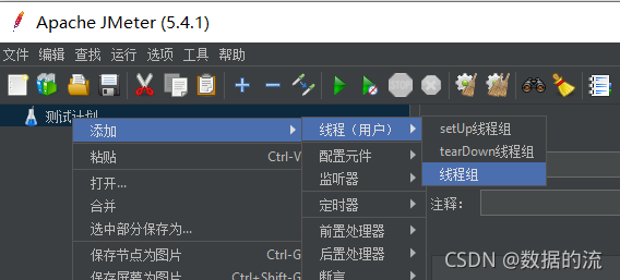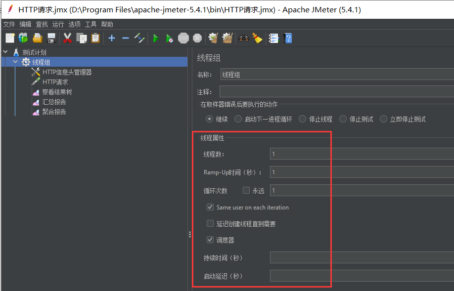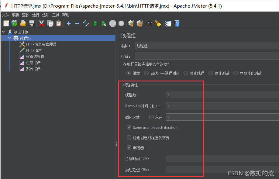 线程组是一个整体测试单元,可以配置本次测试的并发数量、线程启动延迟时间、并发持续时间等信息