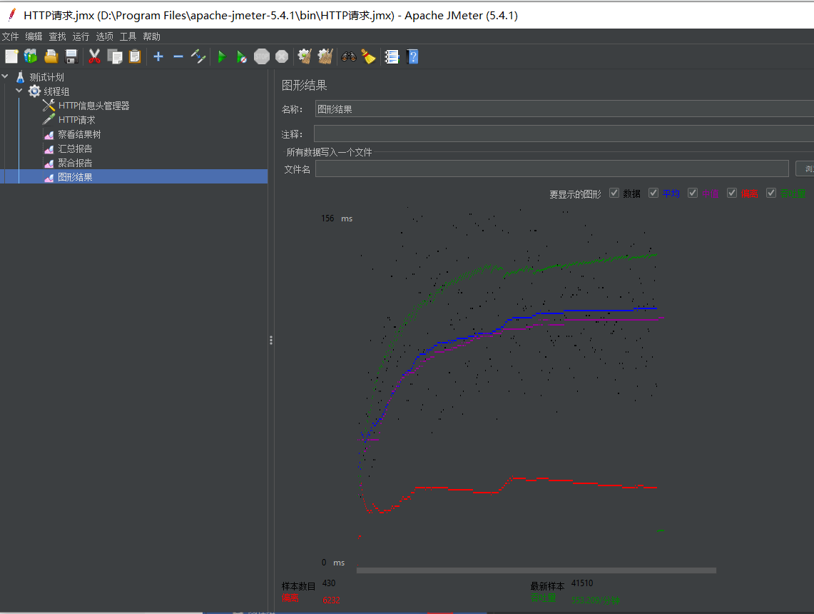 点击工具栏中的启动按钮启动测试,等执行完毕后可以在察看结果树、汇总报告、聚合报告、图形结果,如果要重复执行测试可以点击工具栏中按钮清空监听器中上次执行的结果
