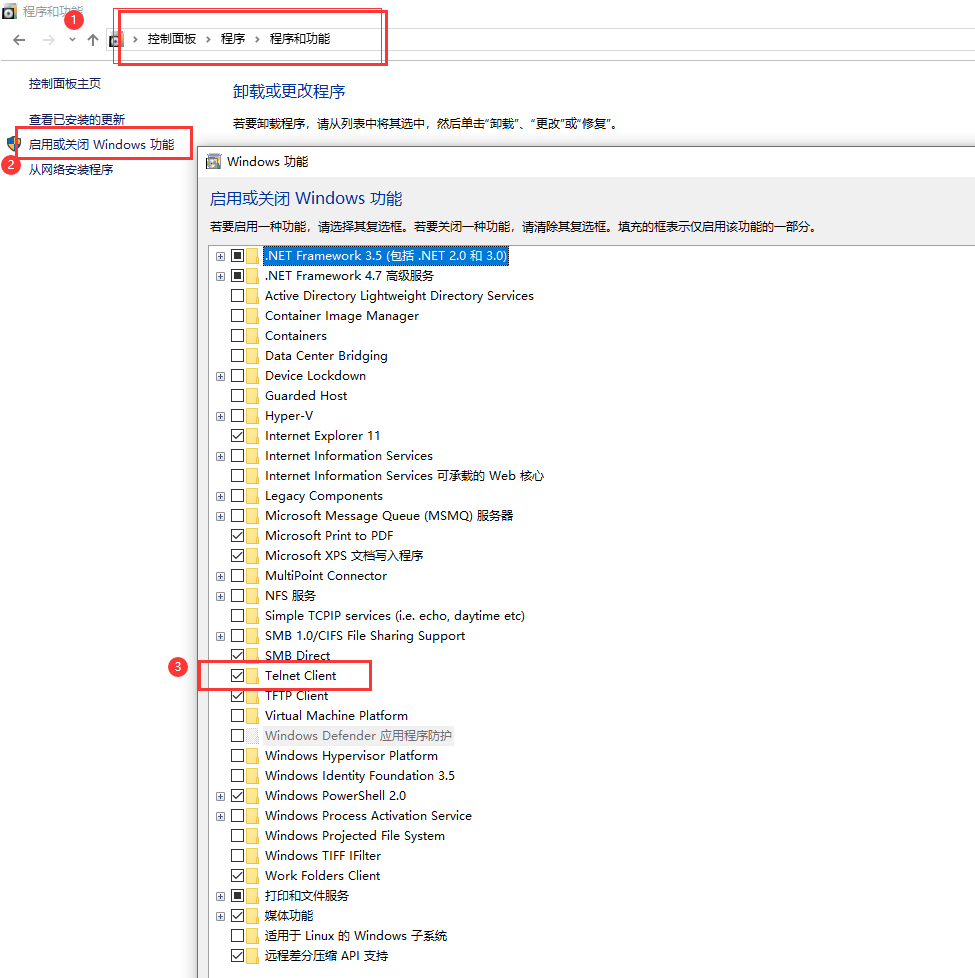 打开电脑----开始---控制面板----程序和功能----打开或关闭WINDOWS功能----TELNET 客户端勾选,并点击确定。