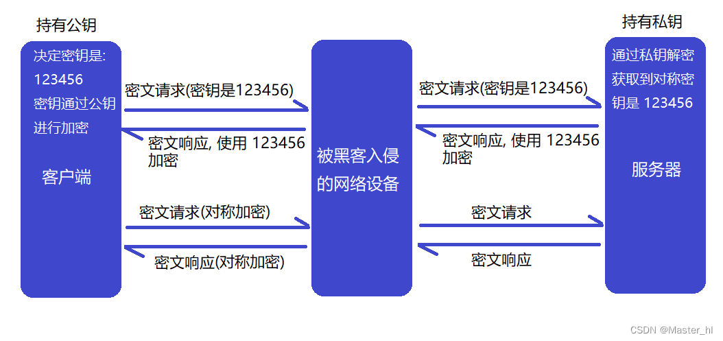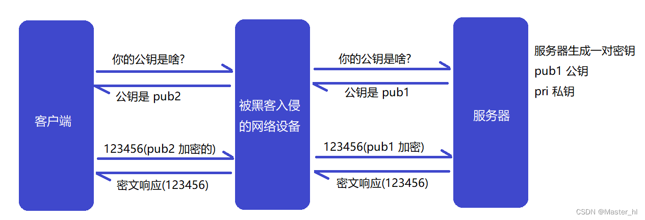 服务器生成一对 "公钥" 和 "私钥" , 将 "公钥" 公开出去后, 黑客先拿到这个 "'公钥" , 然后自己也生成一对 "公钥" 和 "私钥" pub2, pri2, 然后把自己的 "公钥" pub2 返回给客户端, 由于客户端也不知道这个 "公钥" 是不是服务器的, 于是就拿这个 "公钥" 给对称密钥加密, 然后发送给服务器, 此时黑客就能获取到 使用 pub2 加密的对称密钥, 然后拿自己的 "私钥" pri2 进行解密, 就能获取到对称密钥 "123456" 了, 然后再使用之前的 "公钥" 将对称密钥 "123456" 进行加密, 发送给服务器, 那么后续服务器和客户端之间传输的任何数据, 黑客就都知道了.这一招就是典型的 "狸猫换太子".