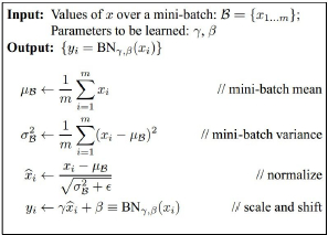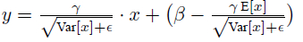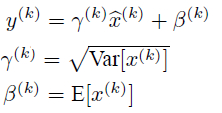 6)如果是仅仅使用上面的归一化公式,对网络某一层A的输出数据做归一化,然后送入网络下一层B,这样是会影响到本层网络A所学习到的特征的。比如我网络中间某一层学习到特征数据本身就分布在S型激活函数的两侧,你强制把它给我归一化处理、标准差也限制在了1,把数据变换成分布于s函数的中间部分,这样就相当于我这一层网络所学习到的特征分布被你搞坏了,这可怎么办?于是文献使出了一招惊天地泣鬼神的招式:变换重构,引入了可学习参数γ、β,这就是算法关键之处: