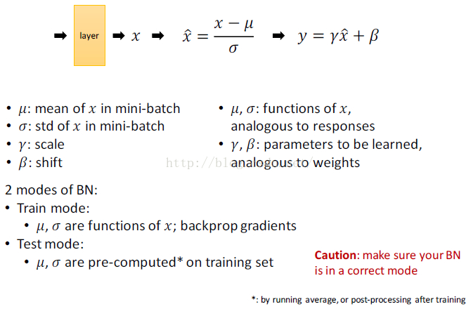 注:以上为学习过程,在测试时,均值和方差(mean/std)不基于小批量进行计算, 可取训练过程中的激活值的均值。