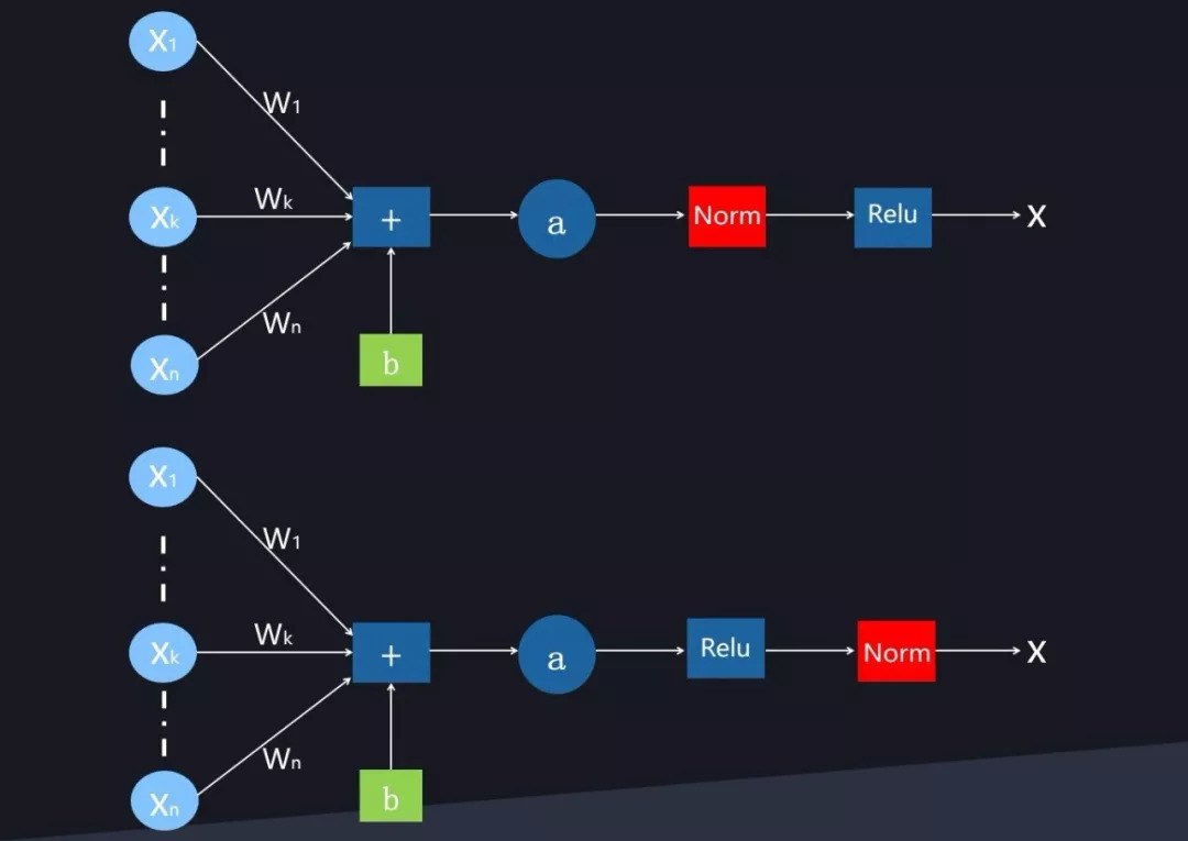 目前有两种在神经元中插入 Normalization 操作的地方(参考图 4),第一种是原始 BN 论文提出的,放在激活函数之前;另外一种是后续研究提出的,放在激活函数之后,不少研究表明将 BN 放在激活函数之后效果更好。