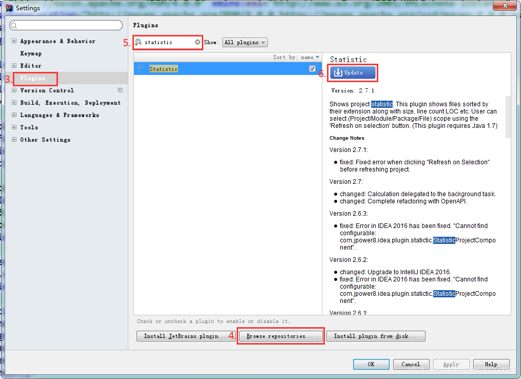 - File → Settings... → Plugins(如下图中3) → Browse repositories...(如下图中4) → 在Plugins区域窗口左上角搜索框搜「statistic」(如下图中5) → install(如下图中6)。