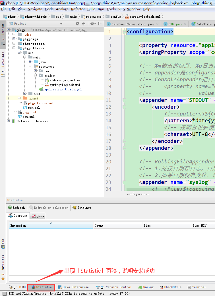 - 下载完成后,重启IDEA,IDEA重新打开后,在底部的工具栏中出现了「Statistic」就说明安装成功了。