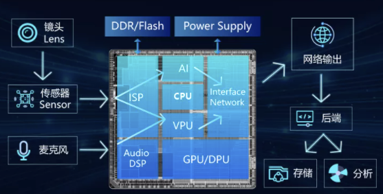 - CPU:CPU是IPC SoC机器视觉的逻辑和控制中心,可以说是大脑的中枢神经。用于协同各个功能模块更高效地处理数据和智能分析。通过一些本地存储设备将ISP处理后的数据存储在本地,或者通过网络设备将图像数据传送到云端进行更多的后续处理。一些视觉算法也可以在CPU中实现。包括视频异常的诊断,越界入侵在内的多种视觉算法,能在实际生活中带来丰富的应用。