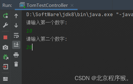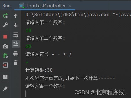 public static void main(String[] args) {while (true) {Scanner scanner = new Scanner(System.in);System.out.println("请输入第一个数字:");int numberOne = scanner.nextInt();System.out.println("请输入第二个数字:");int numberTwo = scanner.nextInt();System.out.println("请输入符号 + - * /");String symbol = scanner.next();switch (symbol) {case "+":System.out.println("计算结果:" + (numberOne + numberTwo));break;case "-":System.out.println("计算结果:" + (numberOne - numberTwo));break;case "*":System.out.println("计算结果:" + (numberOne * numberTwo));break;case "/":System.out.println("计算结果:" + (numberOne / numberTwo));break;default:System.out.println("符号错误请重新输入...");}System.out.println("本次程序计算完成,开始下一次计算------");}
