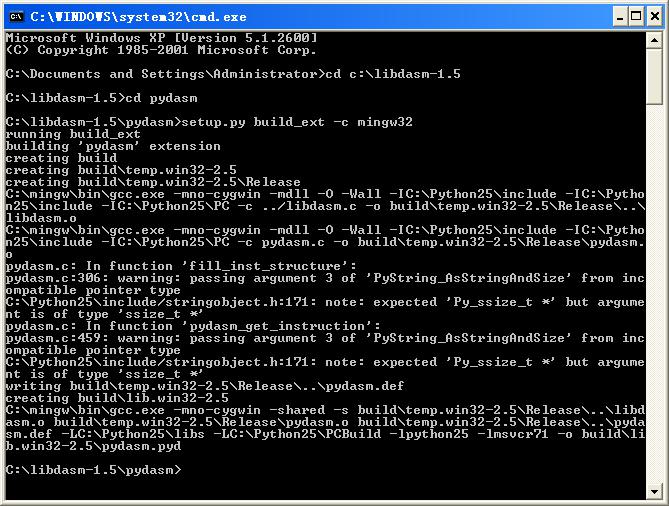 C:\sulley_build\libdisasm\pydasm>python setup.py build_ext -c mingw32 running build_ext building 'pydasm' extension ...snip... C:\sulley_build\libdisasm\pydasm>python setup.py install running install running build running build_ext running install_lib copying build\lib.win32-2.7\pydasm.pyd -> C:\python27\Lib\site-packages running install_egg_info Writing C:\python27\Lib\site-packages\pydasm-1.5-py2.7.egg-info