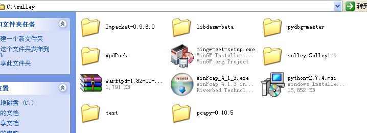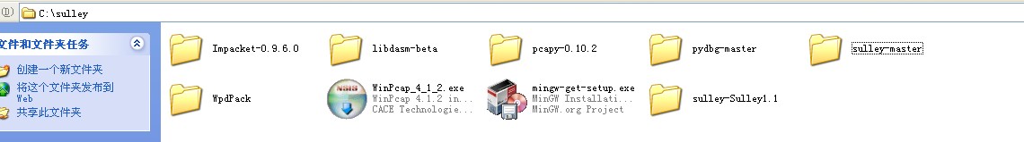 2. OpenRCE-sulley-506678f.zip,4.0.1-WinPcap.exe,pcapy-0.10.8.win32-py2.5. exe,impacket-0.9.9.9.zip, OpenRCE-pydbg-292fff0.zip,libdasm-1.5. tar.gz