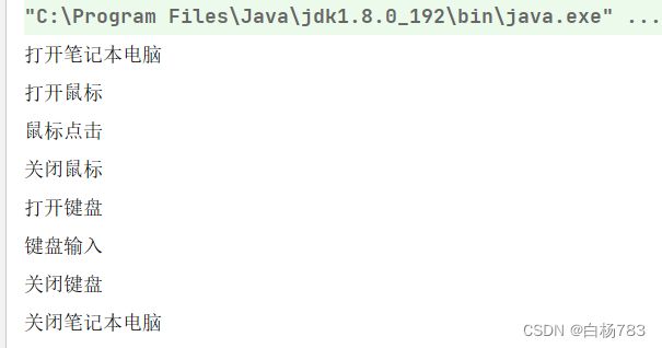 public class KeyBoard implements USB {@Overridepublic void openDevice() {System.out.println("打开键盘");}@Overridepublic void closeDevice() {System.out.println("关闭键盘");}public void inPut(){System.out.println("键盘输入");}