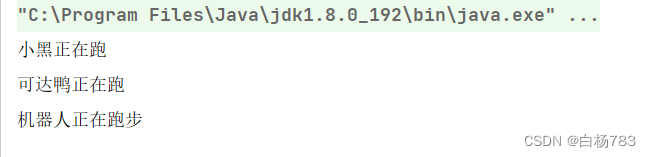 public class Test {public static void walk(IRuning iruning){iruning.runing();}public static void main(String[] args) {walk(new Dog("小黑",2));walk(new Duck("可达鸭",3));walk(new Robot());}