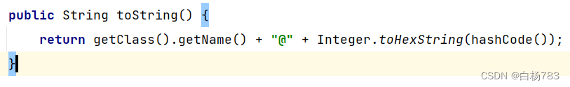 输出对象的名称,和@符号后面跟一串16进制数字,该数字是由hashCode这个方法产生的