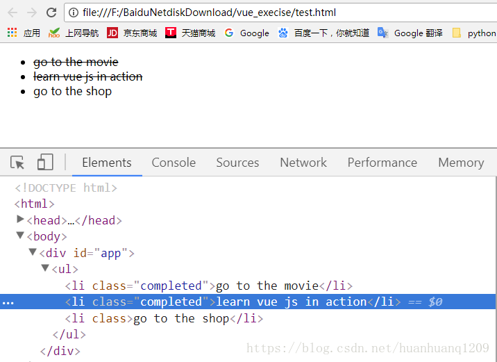 <script>new Vue({el: '#app',data:{tasks:[{body:'go to the movie',completed:false},{body:'learn vue js in action',completed:true},{body:'go to the shop',completed:false}]},computed:{username:function(){return this.first+' '+this.last;}},methods:{toggleTasks:function(task){task.completed=!task.completed}}
