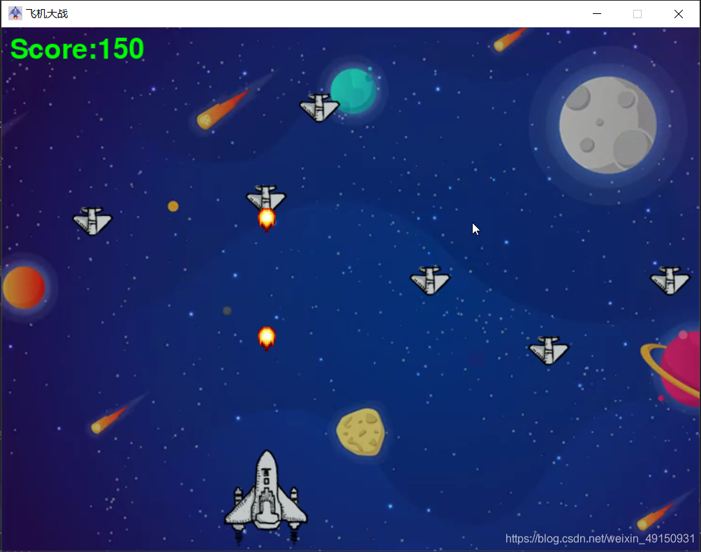 while running:# 4.背景# 每个循环是画一张画组成的# 画出来bgcolorwindows.blit(bgcolor, (0, 0))# 调用这个字体show_score()# event.get操作事件for event in pygame.event.get():# 判断操作类型是不是QUITif event.type == pygame.QUIT:# 如果程序为False就会停止则关闭running = False# 7.控制飞机的移动# 通过控制键盘的事件来控制(playerStep值)飞机的移动if event.type == pygame.KEYDOWN:# 判断按下键盘右键,按下则移动if event.key == pygame.K_RIGHT:plagerStep = 3# 判断按下左键elif event.key == pygame.K_LEFT:plagerStep = -3# 判断按下空格健的反应elif event.key == pygame.K_SPACE:# 创建一个子弹b = Bullet()bullets.append(b)# 判断松来按键停止,if event.type == pygame.KEYUP:plagerStep = 0# 调用飞机的类型的函数fiji_type()# 调用敌人这个函数enemy()show_bullets() # 显示子弹# 游戏结束语check_over()# 刷新更新数据pygame.display.update()