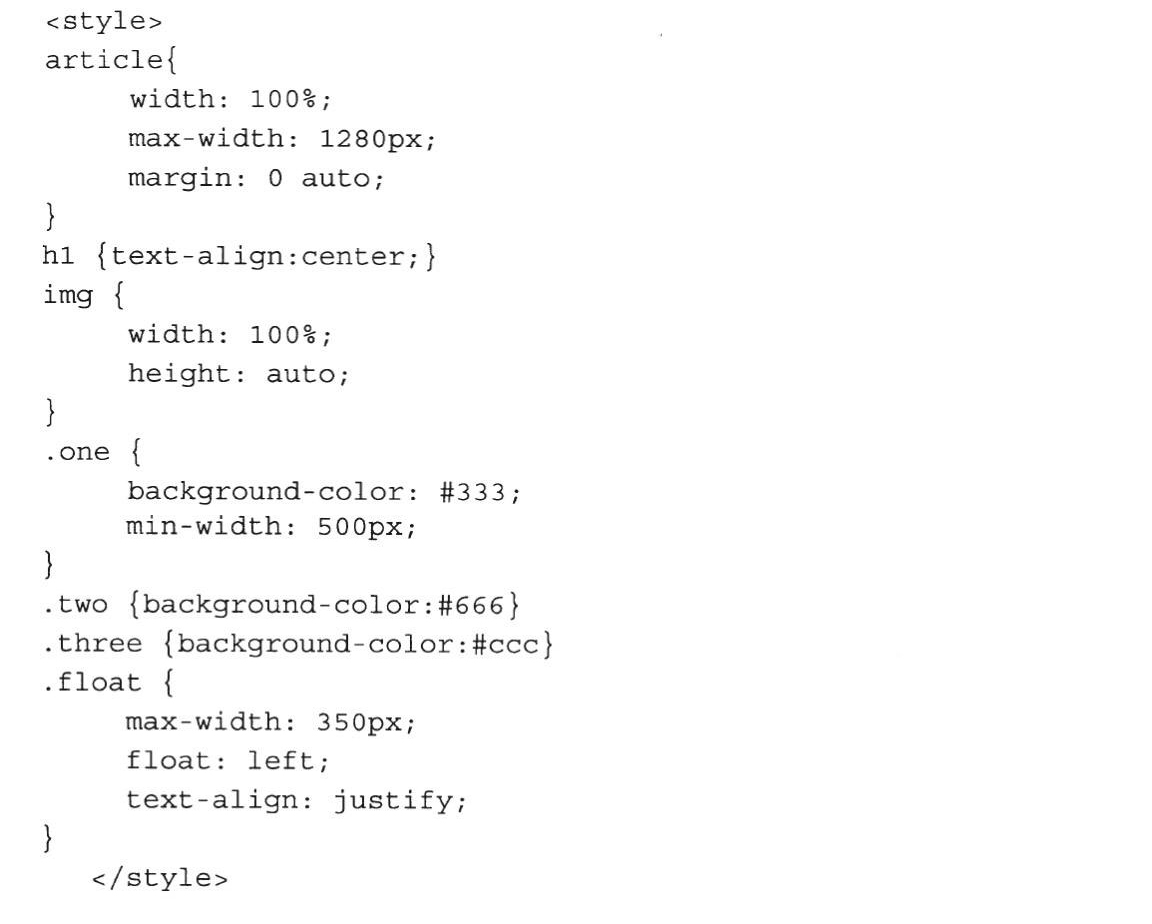 接下来,为.article元素创建对应的样式,并赋予属性值width:100%;、max-width:1280px;以及自动的侧边距值。然后将h1标题居中。设置img元素属性为width:100%和height:auto;,使得该元素自适应于父元素。而对于含有img的外部浮动元素,设定属性min-width的值为500px。当然,也可以给每个浮动元素设置不同的背景色,从而让它们更容易辨识。但是对于响应式布局来说,这不是必需的。对于已经设置过.float类的浮动元素,可以添加max-width:350px的属性值,并同时设置向左浮动。为了进一步看得更清楚,设置文本为两端对齐。