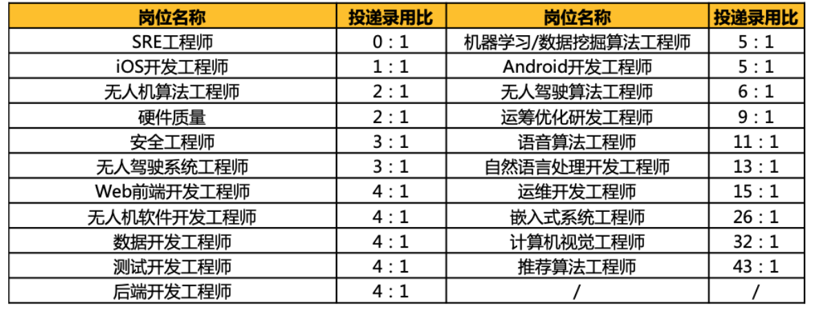 特别要提醒大家注意的是,各个方向和岗位的竞争激烈程度每年是不一样的。今年的推荐算法和嵌入式系统、计算机视觉竞争比较激烈,而前端尤其是移动客户端开发、测试、硬件、安全、数据领域则相对平和。以下是2020年春季美团技术团队部分岗位(实习生)的投递录用比(已经收到的简历数:拟招聘的岗位数),供大家参考: