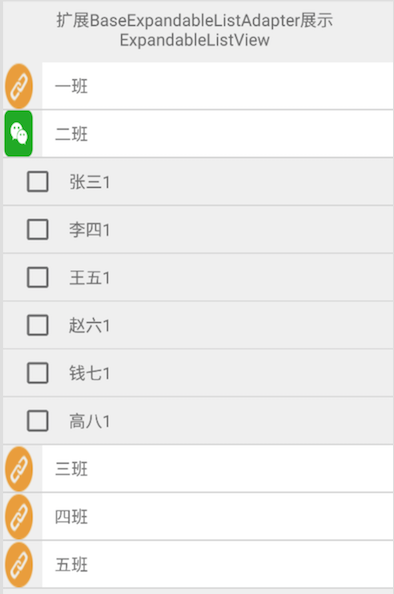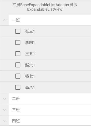 /*** Created by CnPeng on 2017/1/21.* <p>* 使用BaseExpandableLsitAdapter 展示ExpandableLsitView 的具体内容*/public class ExpandableListViewActivity extends AppCompatActivity {private View.OnClickListener ivGoToChildClickListener;@Overrideprotected void onCreate(Bundle savedInstanceState) {super.onCreate(savedInstanceState);setContentView(R.layout.activity_expandablelv);init();}private void init() {final ExpandableListView elv01 = (ExpandableListView) findViewById(R.id.elv_01);//模拟数据(数组,集合都可以,这里使用数组)final String[] classes = new String[]{"一班", "二班", "三班", "四班","五班"};final String[][] students = new String[][]{{"张三1", "李四1", "王五1", "赵六1", "钱七1", "高八1"}, {"张三1", "李四1", "王五1", "赵六1", "钱七1", "高八1"}, {"张三1", "李四1", "王五1", "赵六1", "钱七1", "高八1"}, {"张三1", "李四1", "王五1", "赵六1", "钱七1","高八1"},{}};//自定义 展开/收起  图标的点击事件。position和 isExpand 都是通过tag 传递的ivGoToChildClickListener = new View.OnClickListener() {@Overridepublic void onClick(View v) {//获取被点击图标所在的group的索引Map<String, Object> map = (Map<String, Object>) v.getTag();int groupPosition = (int) map.get("groupPosition");
