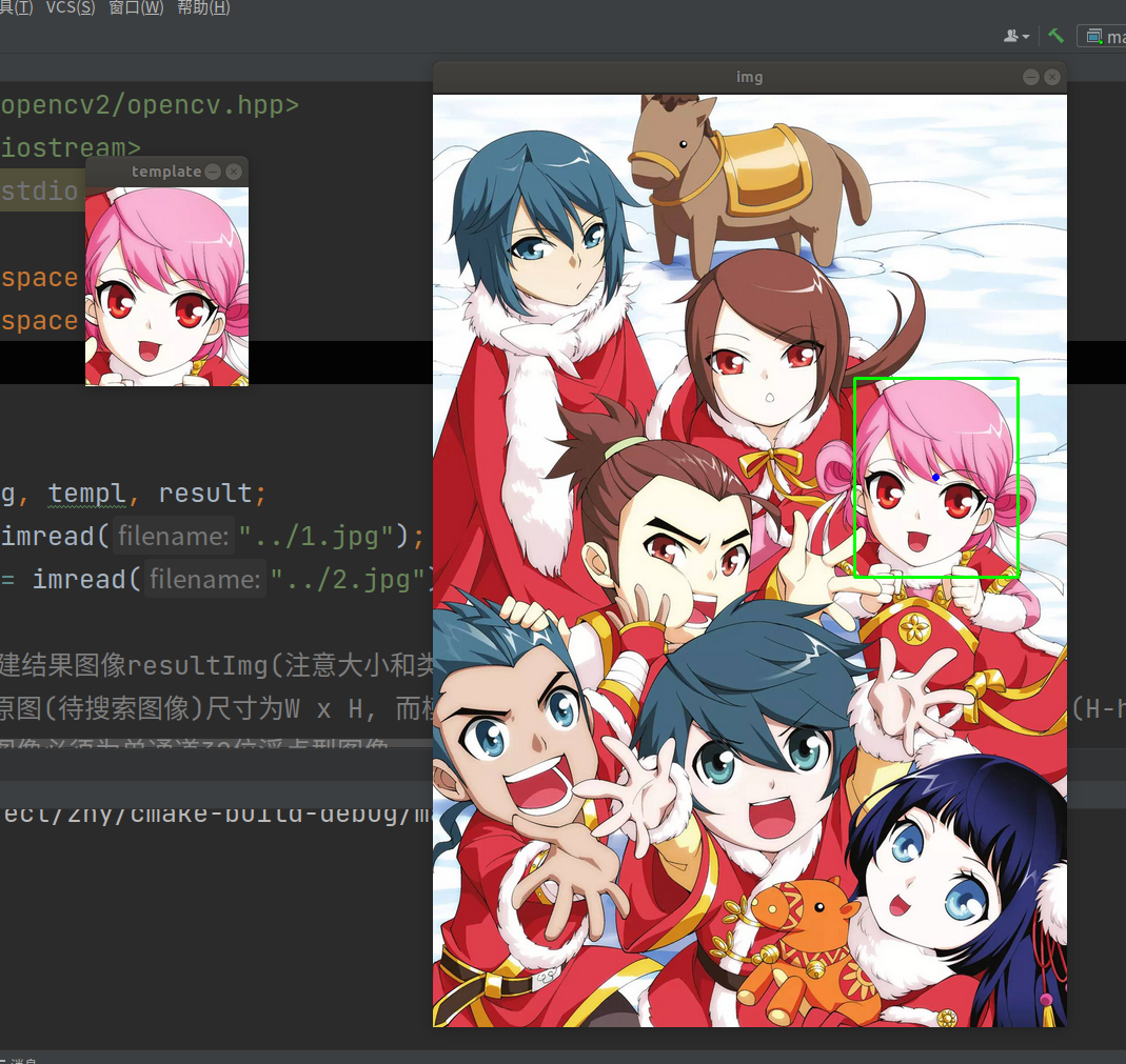 {Mat img, templ, result; //img为待测图 templ是目标图片 result是结构图img = imread("../1.jpg");templ = imread("../2.jpg");//1.构建结果图像resultImg(注意大小和类型)//如果原图(待搜索图像)尺寸为W x H, 而模版尺寸为 w x h, 则结果图像尺寸一定是(W-w+1)x(H-h+1)//结果图像必须为单通道32位浮点型图像int result_cols = img.cols - templ.cols + 1; //result的尺寸大小int result_rows = img.rows - templ.rows + 1;result.create(result_cols, result_rows, CV_32FC1);//2.模版匹配//这里我们使用的匹配算法是标准平方差匹配 method=CV_TM_SQDIFF_NORMED,数值越小匹配度越好matchTemplate(img, templ, result, CV_TM_SQDIFF_NORMED);//3.正则化(归一化到0-1)normalize(result, result, 0, 1, NORM_MINMAX, -1, Mat());//4.找出resultImg中的最大值及其位置double minVal = -1;double maxVal;Point minLoc;Point maxLoc;Point matchLoc;cout << "匹配度:" << minVal << endl;// 定位极值的函数minMaxLoc(result, &minVal, &maxVal, &minLoc, &maxLoc, Mat());cout << "匹配度:" << minVal << endl;cout << "minPosition: " << minLoc << endl;cout << "maxPosition: " << maxLoc << endl;matchLoc = minLoc; //5.根据resultImg中的最大值位置在源图上画出矩形和中心点Point center = Point(minLoc.x + templ.cols / 2, minLoc.y + templ.rows / 2);rectangle(img, matchLoc, Point(matchLoc.x + templ.cols, matchLoc.y + templ.rows), Scalar(0, 255, 0), 2, 8, 0);circle(img, center, 2, Scalar(255, 0, 0), 2);imshow("img", img);imshow("template", templ);waitKey(0);return 0;