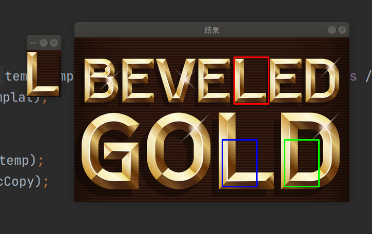 {Mat src = imread("../1.jpg");Mat srcCopy = src.clone();Mat temp = imread("../2.jpg");Mat result;if (src.empty() || temp.empty()){cout << "打开图片失败" << endl;return 0;}vector<Mat> templat;vector<float> minV;vector<Point> minL;int srcW, srcH, templatW, templatH, resultH, resultW;srcW = src.cols;srcH = src.rows;templat.push_back(temp);double minValue, maxValue;Point minLoc, maxLoc;for (int i=0;i<10;i++){cout << i << ": ";templatW = templat[i].cols;templatH = templat[i].rows;if (srcW < templatW || srcH < templatH){cout << "模板不能比原图大" << endl;return 0;}resultW = srcW - templatW + 1;resultH = srcH - templatH + 1;result.create(Size(resultW, resultH), CV_32FC1);matchTemplate(src, templat[i], result, CV_TM_SQDIFF_NORMED);minMaxLoc(result, &minValue, &maxValue, &minLoc, &maxLoc);cout << "min1: " << minValue << endl;if (minValue<=0.070055){rectangle(srcCopy, minLoc, Point(minLoc.x + templatW, minLoc.y + templatH), Scalar(0, 0, 255), 2, 8, 0);Point new_minLoc;new_minLoc = getNextMinLoc(result, minLoc, maxValue, templatW, templatH);float *data = result.ptr<float>(new_minLoc.y);cout << "min2: " << data[new_minLoc.x] << " ";if (data[new_minLoc.x]<=0.5){cout << "进这个函数了:" << i << ":" << new_minLoc.x;cout << " " << new_minLoc.y;rectangle(srcCopy, new_minLoc, Point(new_minLoc.x + templatW, new_minLoc.y + templatH),Scalar(0, 255, 0), 2, 8, 0);new_minLoc = getNextMinLoc(result, new_minLoc, maxValue, templatW, templatH);}float *data1 = result.ptr<float>(new_minLoc.y);cout << "min3: " << data1[new_minLoc.x] << " " << endl;if (data1[new_minLoc.x] <= 0.4){rectangle(srcCopy, new_minLoc, Point(new_minLoc.x + templatW, new_minLoc.y + templatH),Scalar(255, 0, 0), 2, 8, 0);}}cout << "#" << endl;Mat temp_templat;resize(templat[i], temp_templat, Size(templat[i].cols / 1.1, templat[i].rows / 1.1));templat.push_back(temp_templat);}imshow("结果", srcCopy);waitKey(0);return 0;