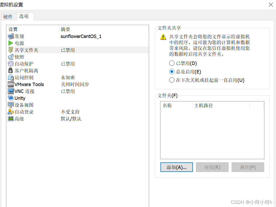 2)进入虚拟机设置后,点击选项页面,点击共享文件夹,点击总是启用,再点击下面的添加;