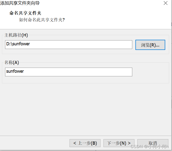4)进入添加共享文件夹向导页面后,点击浏览,找到你在Windows上创建的想要共享的文件夹,点击下一步,再点击启用此共享,完成后点击确定;