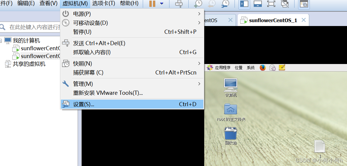 1)点击菜单栏中的虚拟机,点击设置,进入虚拟机设置