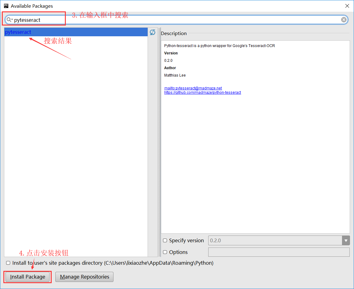 安装pytesseract时,同时安装pillow,所以我们只需安装pytesseract即可。