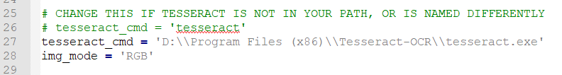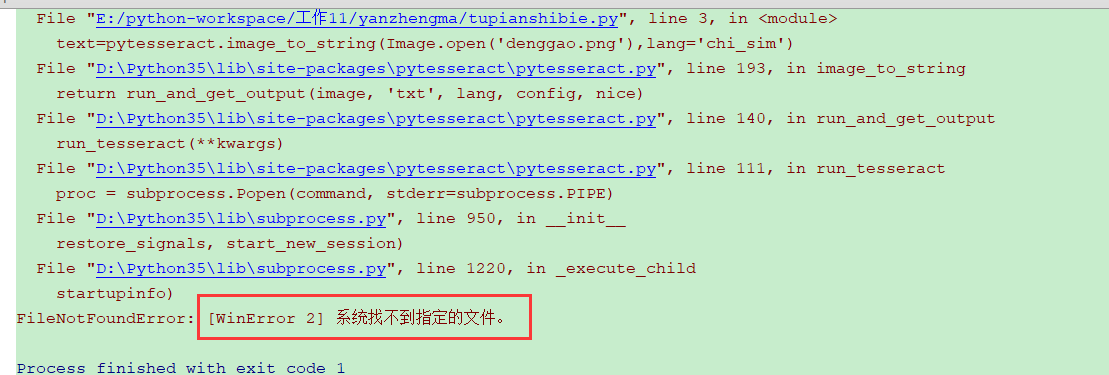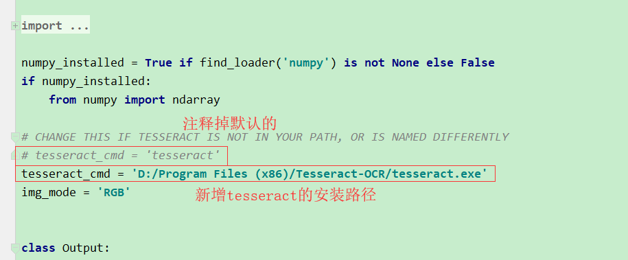 在Python安装目录(如:D:\Python35\Lib\site-packages\pytesseract) 中修改 pytesseract.py文件。