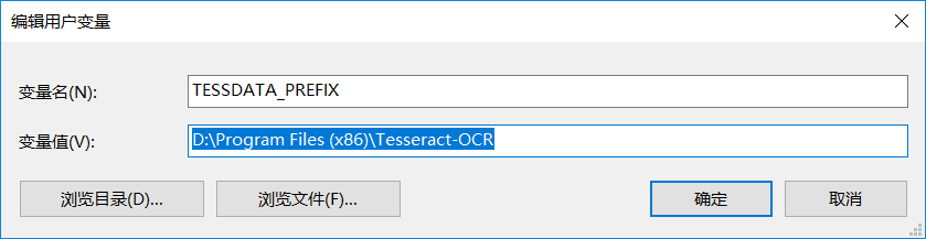4.解决方法:将tessdata目录的上级目录所在路径:(默认为tesseract-ocr安装目录)添加至TESSDATA_PREFIX环境变量中,如下图: