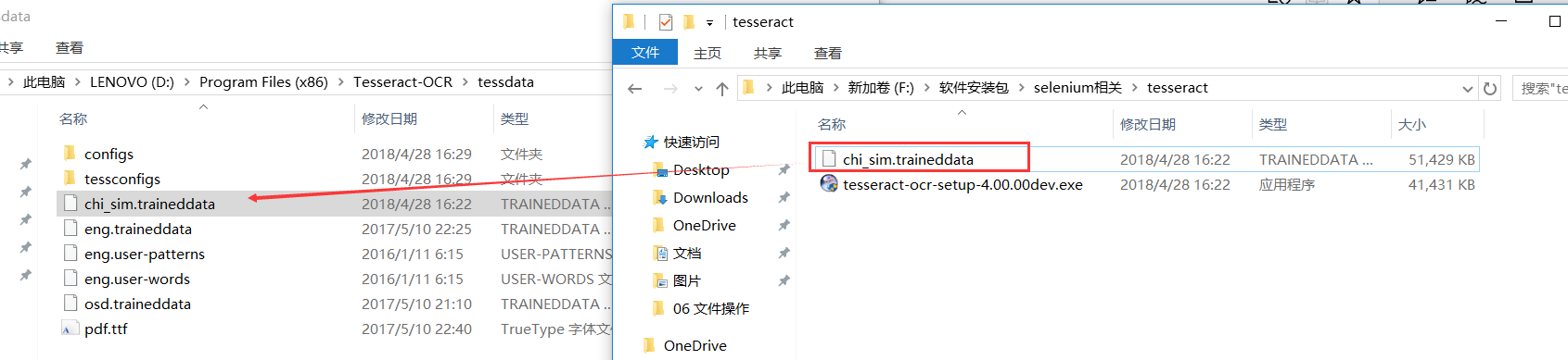 将下载到的文件:chi_sim.traineddata 放到Tesseract-OCR安装目录 D:\Program Files (x86)\Tesseract-OCR\tessdata 下,如图: