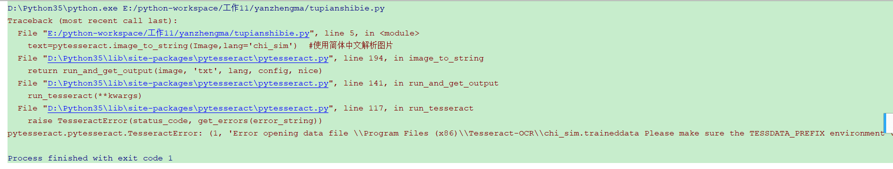 pytesseract.pytesseract.TesseractError: (1, 'Error opening data file \\Program Files (x86)\\Tesseract-OCR\\chi_sim.traineddata Please make sure the TESSDATA_PREFIX environment variable is set to your "tessdata" directory. Failed loading language \'chi_sim\' Tesseract couldn\'t load any languages! Could not initialize tesseract.')