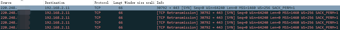 图2为Nginx服务器抓包图,显示服务器接收到了TCP握手请求,但是未做应答,直到客户端重试超时结束。很明显,并不是网络丢包而导致的TCP握手失败,而是某种机制导致的服务器直接抛弃了客户端的请求报文。