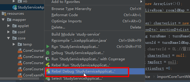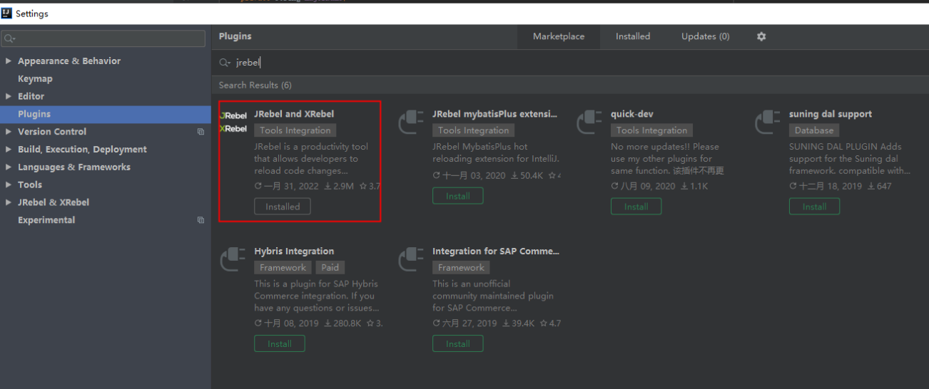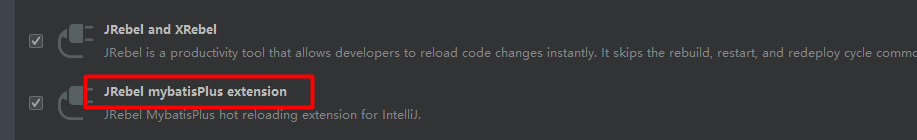 ====注意,如果用到mybatis,需要reload xml的话,需要额外安装一个Jrebel mybatisPlus extension