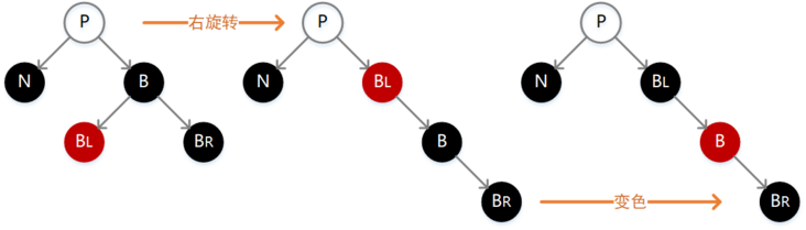 如下图,此时我们需要先执行一次右旋转操作,然后互换 B 与 BL 的颜色,操作之后通过所有结点的路径长度并没有发生变化,却让 N 有了一个新的黑色兄弟结点,并且该兄弟结点的右孩子为红色,从而可以按照接下去介绍的一种场景继续调整。