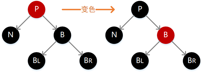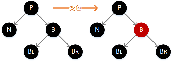 如下图,此时我们只需要简单互换 P 和 B 的颜色,这种情况下对于不通过 N 的结点路径没有影响,但是却让通过 N 的结点路径加 1,正好弥补之前删除操作所带来的损失。