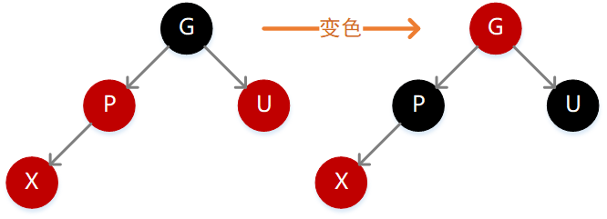 因为 P 为红色,按照性质 4 则 G 必定为黑色,如果 X 的值小于 P,则需要在 P 的左子位置插入(如下图),插入后不满足性质 4,此时只需要执行一次变色操作,将 P、G、U 的颜色反转一下即可,因为 G 变为红色,所以路径长度减 1,但是因为 P 和 U 都变为了黑色,所以路径长度又加 1,最终长度不变,但此时 G 变为了红色,所以需要继续向上递归。