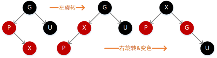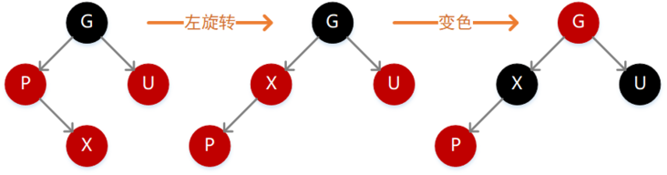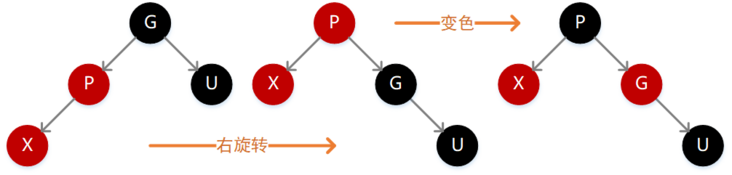 因为 P 为红色,按照性质 4 则 G 必定为黑色,如果 X 的值小于 P,则需要在 P 的左子位置插入(如下图),插入后不满足性质 4,此时需要先执行一次右旋转,旋转之后仍然违背性质 4,同时左子树的高度减 1,这个时候需要再执行一次变色操作即可满足定义。