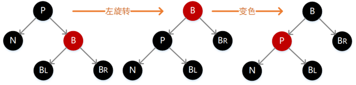 如下图,此时我们需要先执行一次左旋转,并互换 P 和 B 的颜色,同时将 B 的右孩子结点变为黑色。变更之后,除 N 外其余结点的路径长度未发生变化,但是经过 N 的路径上却增加了一个黑色结点,这刚好弥补之前删除操作所带来的损失。