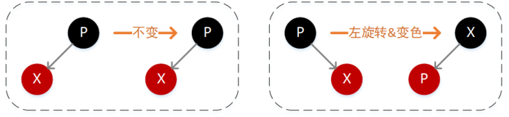 如果 X 的值大于 P,则需要在 P 的右子位置插入(如下图),插入后不满足性质 4,此时我们需要执行一次左旋转,然后就转换成了上面这种情况,继续右旋转、变色即可。
