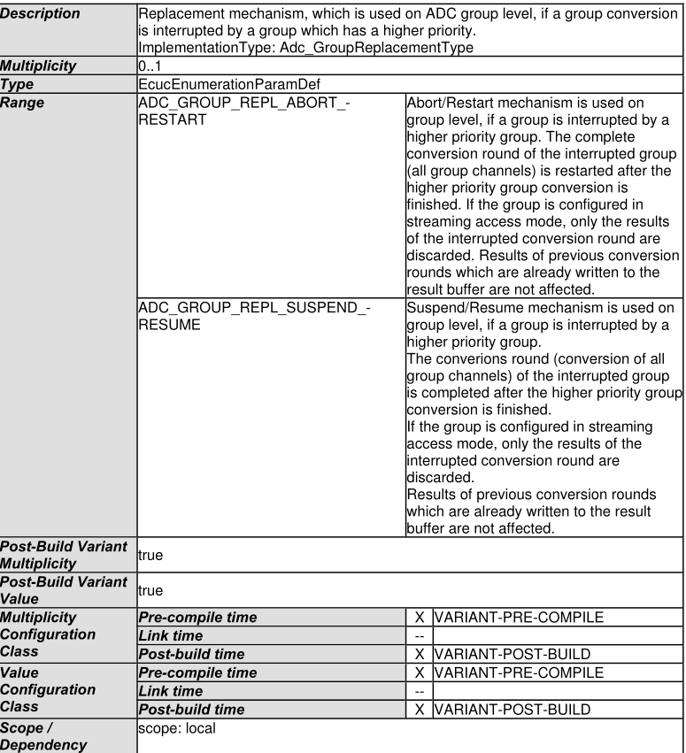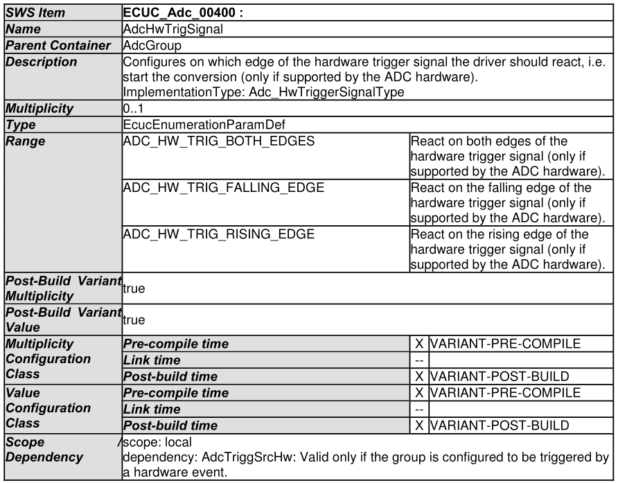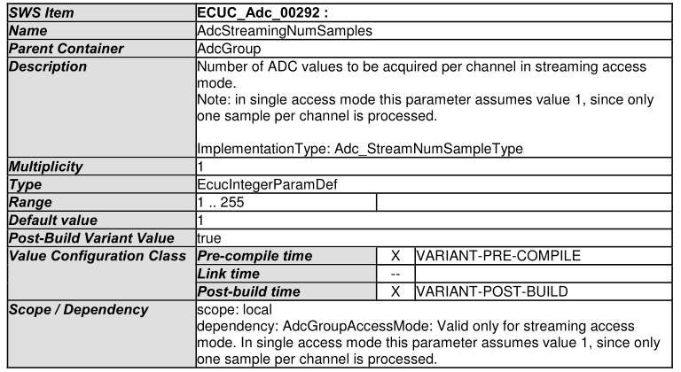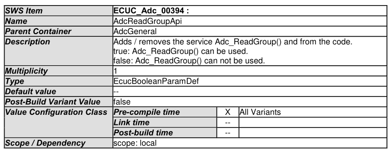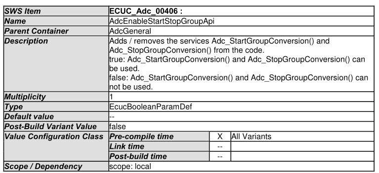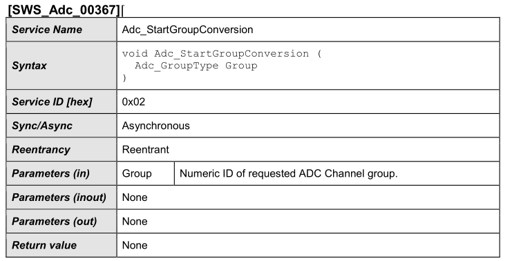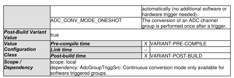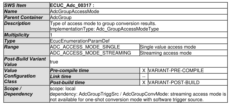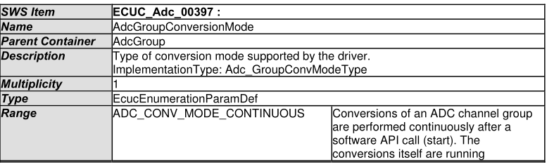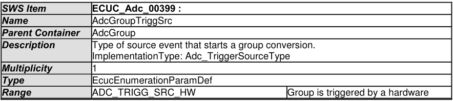 AdcGroup也是Autosar规范中的配置项,传送门,属于AdcHwUnit的子配置项。该Group并不是芯片硬件中的Group,Autosar AdcGroup中包含了AdcHwUnit定义的AdcChannel,Adc的转换模式,触发方式等。
