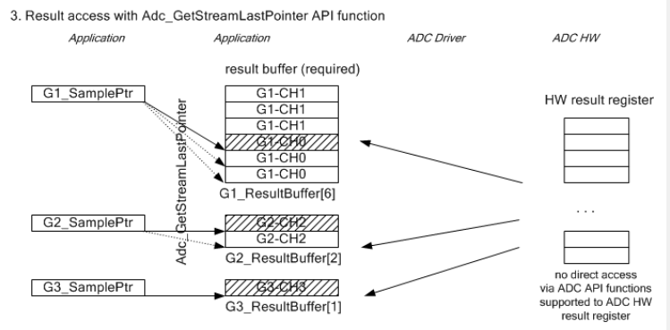 调用Adc_GetStreamLastPointer来访问结果缓冲区中最新转换轮的结果