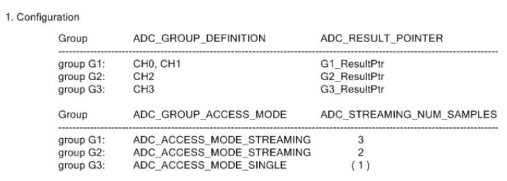 Group1包含2个通道CH0和CH1,结果存放在指针G1_ResultPtr中,访问模式为streaming,每个通道采样缓存大小为3