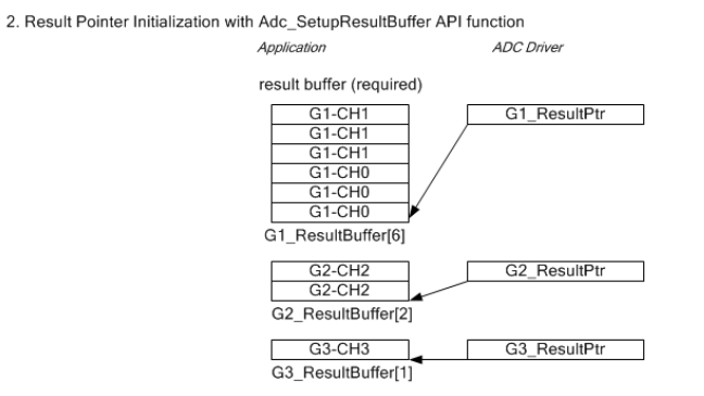 使用API函数Adc_SetupResultBuffer初始化组结果指针,该函数初始化组结果指针以指向指定的应用程序结果缓冲区